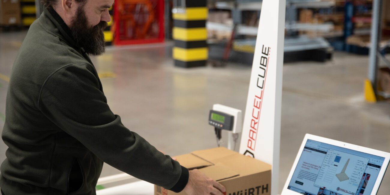 Parcelcube 900 in use at Würth warehouse, measuring packages, shelves of inventory in the background